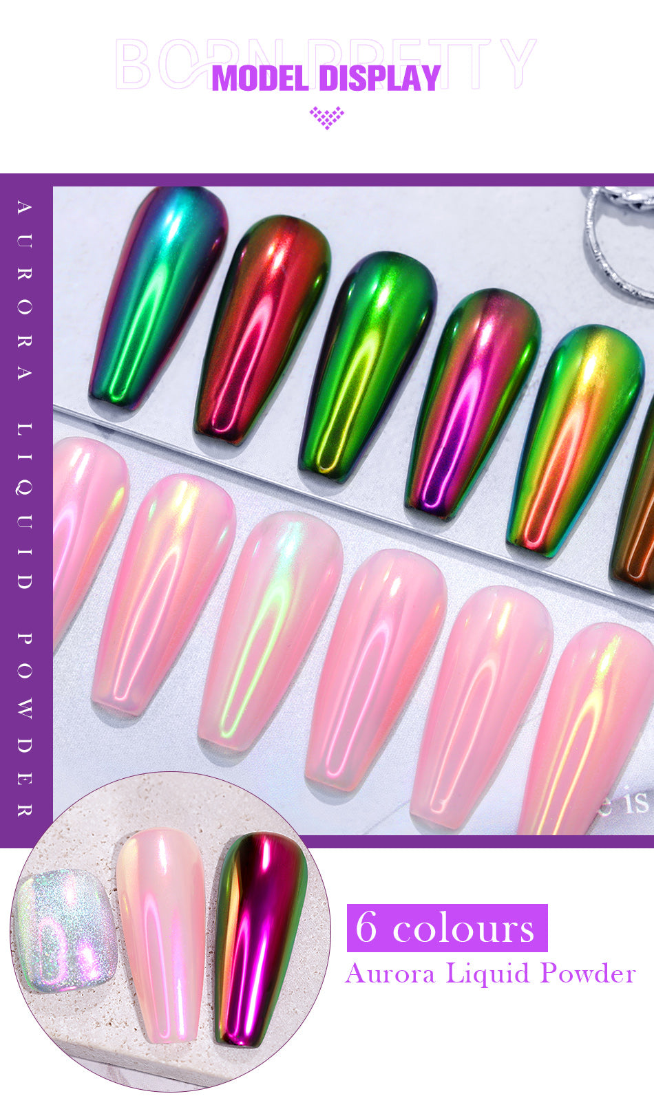 A 10ml bottle of BORN PRETTY Aurora Liquid Powder, complete with metallic mirror chameleon pigment, for a flashy, manicured nail art look.
