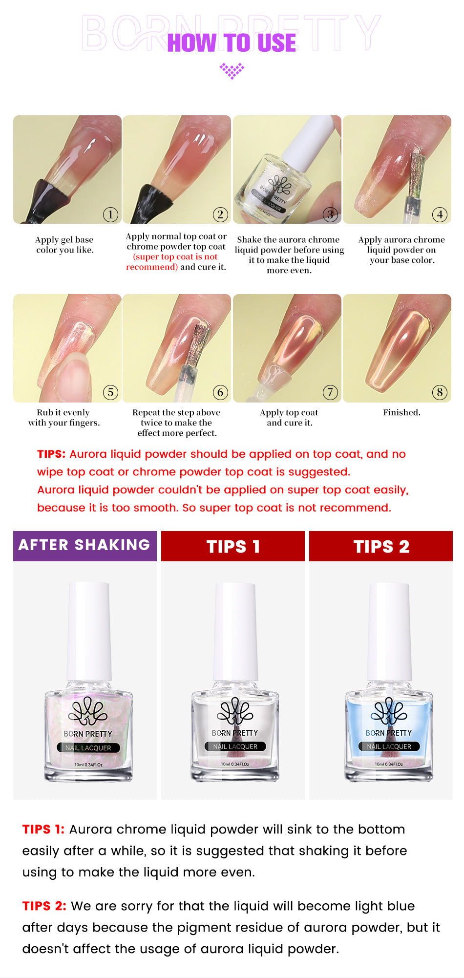 Shake it up before using, so the liquid's even. Apply it on regular top coat or chrome powder top coat for best results—any 'super top coat' isn't the best choice and not recommended.